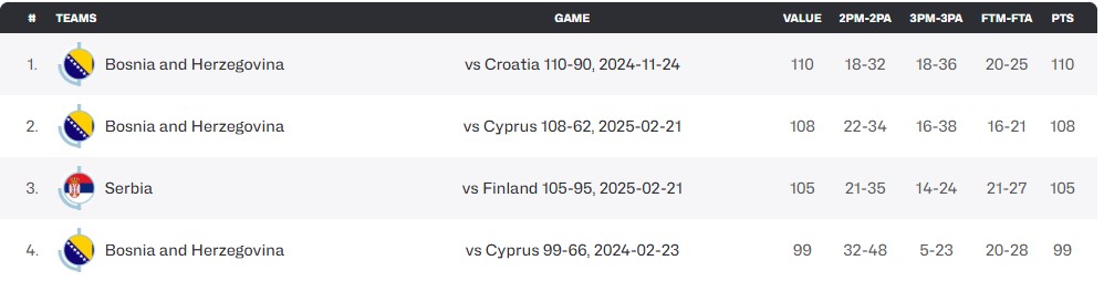 Osim toga, BiH drži još dva rekorda – prve dvije pozicije po najviše ubačenih poena na jednom meču. Prva je protiv Hrvatske u Skenderiji, kada je postignuto 110 poena, dok je druga iz Mejdana protiv Kipra od prije dva dana, kada su naši košarkaši ubacili 108 poena.