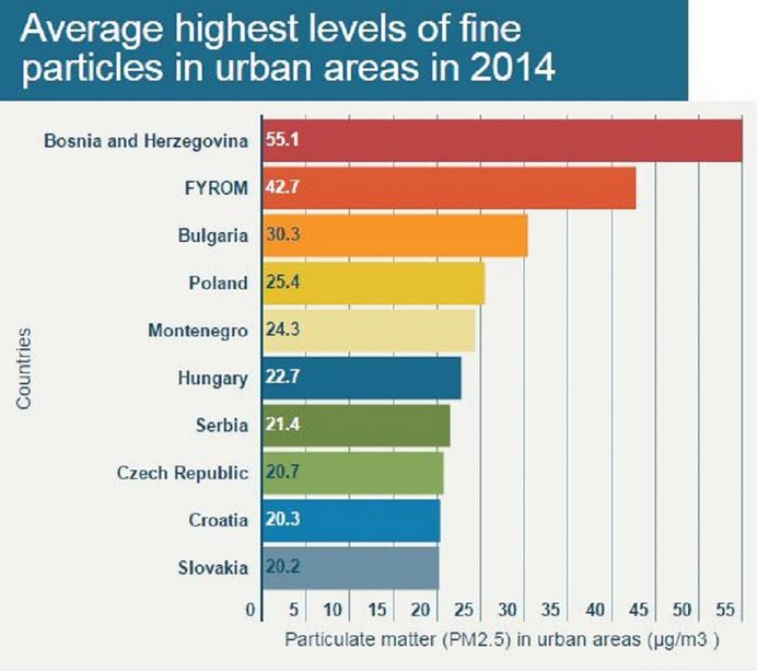 BiH ima 55.1 mikrograma po kubnom metru zraka, dok Makedonija ima 42.7. Slijedi Bugarska sa 30.3, Poljska sa 25.4, Crna Gora sa 24.3, Mađarska sa 22.7, Srbija sa 21.4 i Češka sa 20.7 mikrograma po kubnom metru.