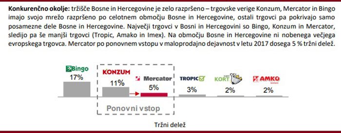 – Najveći trgovci u BiH su Bingo, Konzum i Mercator, a slijede manji Tropic, Amko i Imex. Na području BiH nema većeg evropskog lanca. Udio Mercatora 2017. godine je iznosio 5 posto – stoji u dokumentu.