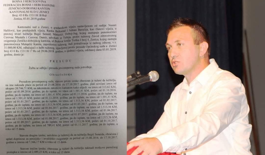 Prema presudi Općinskog suda u Zenici od 29.06.2018.god, a koja je potvrđena presudom Kantonalnog suda u Zenici 03.01.2019.god. i kojom se žalba ZZO ZDK odbija i presuda prvostepenog suda potvrđuje, Zavod mu je kao tužitelju dužan u roku od 15 dana nadoknaditi iznos od preko 30.000 KM. Tačnije, na ime naknade za plaće iznos od 20.746,71 KM, sa zakonskim kamatama, naknade na ime doprinosa iznos od 7.366,17 KM i naknade za troškove parničnog postupka iznos od 2.489,25 KM.