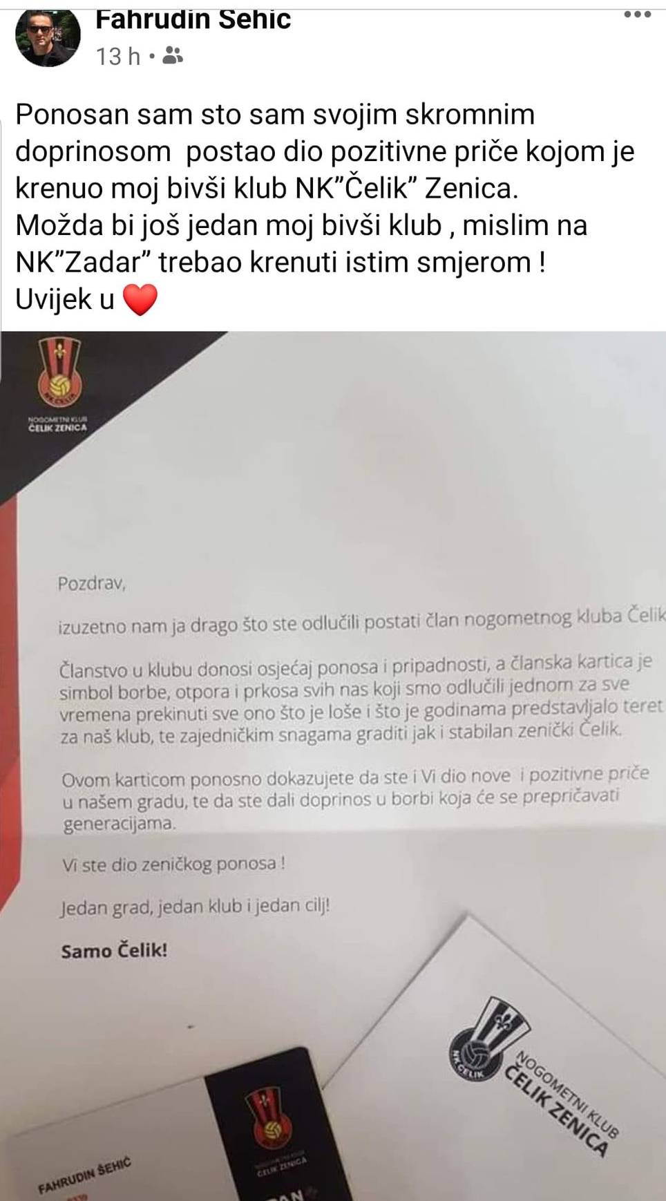 Kladušanin Fahrudin Šehić, koji radi i živi u Sjedinjenim Američkim Državama (SAD), oduševio je svoje poznanike, a posebno Zeničane potezom, koji je objavio na svom FB profilu. On je pokazao Člansku kartu NK Čelik, pokazavši privrženost klubu za koji je branio prije više od tri decenije.