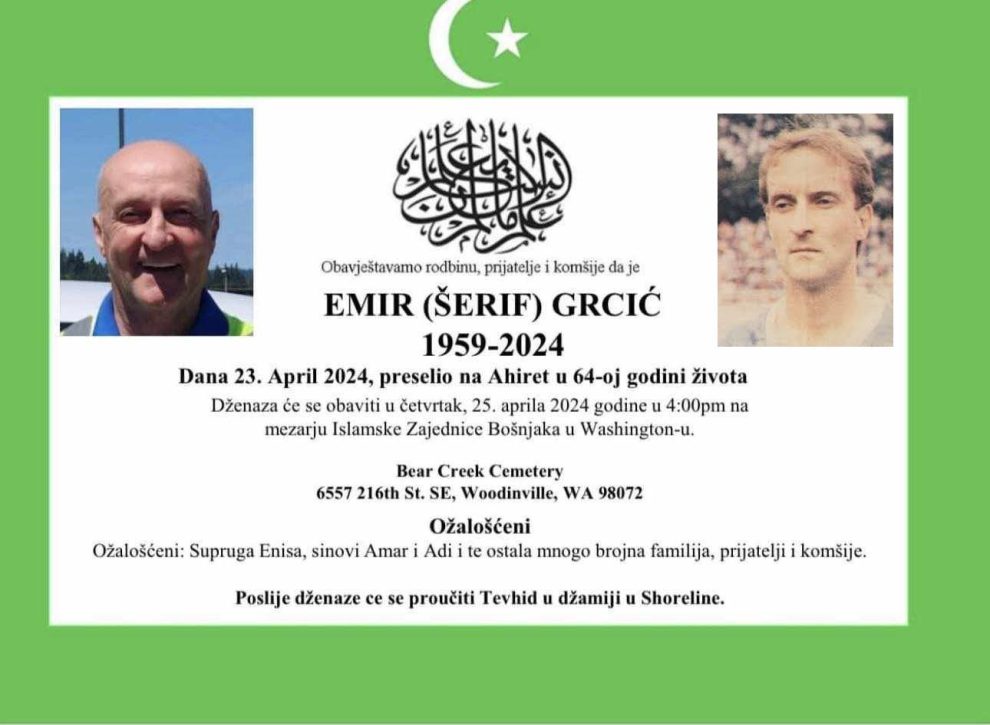 U američkom gradu Vudinvil (Woodinville), država Vašington (Washington), na Ahiret je u utorak preselio Emir (Šerifa) Grcić, bivši nogometaš NK Čelik i nekoliko bosansko-hercegovačkih i klubova iz Hrvatske, Srbije i Turske.
