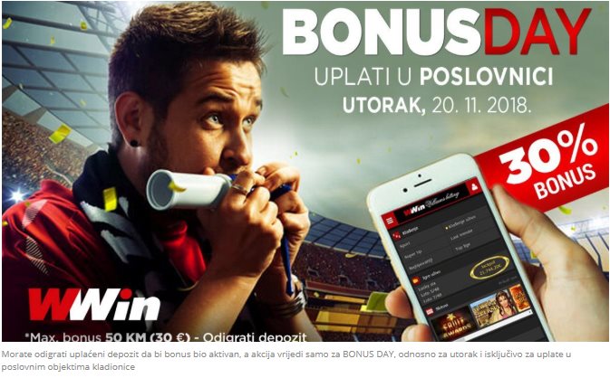 Na Bonus day u utorak 20.11. uplatite u bilo kojoj poslovnici kladionice WWin u Federaciji BiH ili Republici Srpskoj i dobićete bonus u vrijednosti od 30% od uplate.