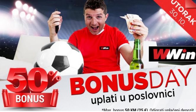 Na Bonus day u utorak 30.10. uplatite u bilo kojoj poslovnici kladionice WWin u Federaciji BiH ili Republici Srpskoj i dobićete bonus u vrijednosti od 50% od uplate.