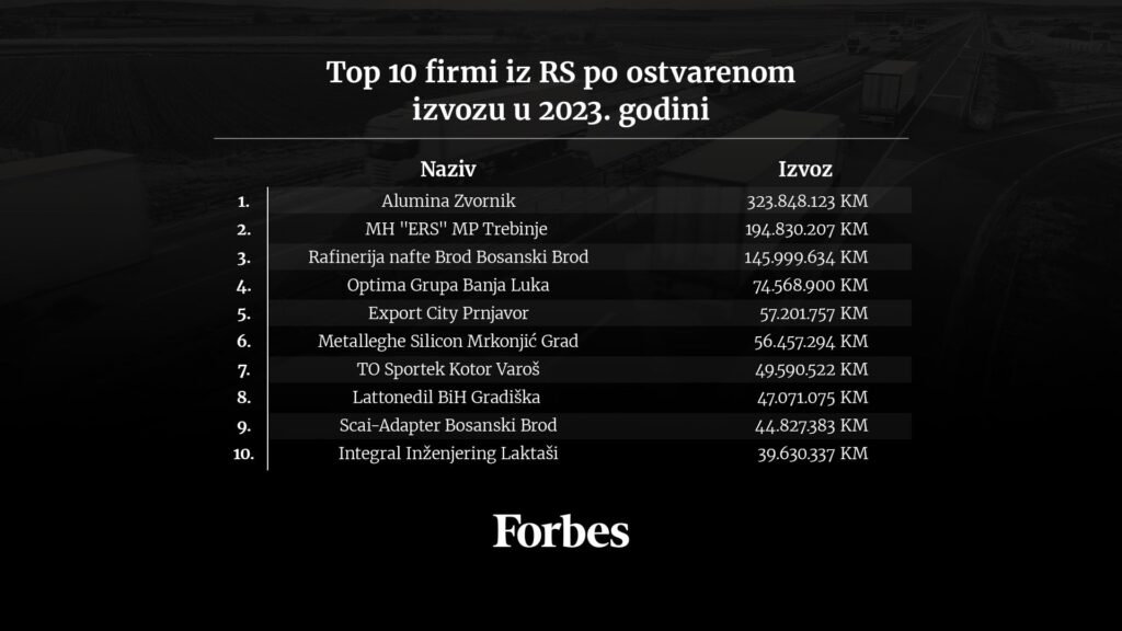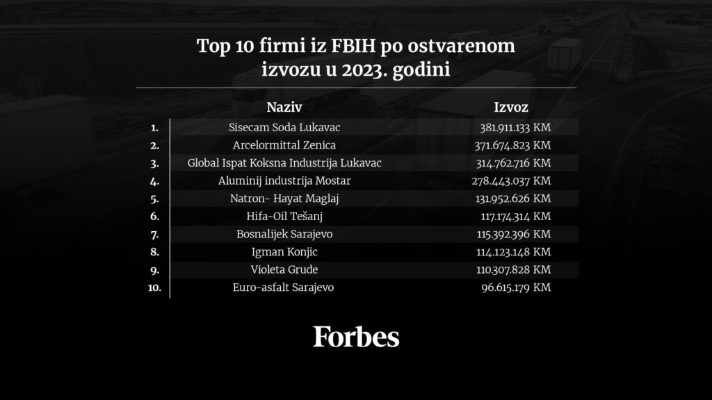 Iako je Bosna i Hercegovina mala ekonomija i izložena utjecajima globalnih geopolitičkih promjena, ona je i prostor uspješnih kompanija koje svoje proizvode plasiraju na inozemna tržišta. Forbes Bosne i Hercegovine uradio je opsežnu analizu najuspješnijih kompanija izvoznica iz BiH, njihovih prihoda kao i djelatnosti u kojima su firme iz BiH konkurentne na zapadnom tržištu. Prema podacima koje nam je dostavila Uprava za indirektno oporezivanje BiH od januara do augusta ove godine deset najuspješnijih firmi ostvarilo je izvoz u vrijednosti 10.839.852.133 KM, što je za 728 miliona i 824 hiljade manje u odnosu na period januar-august 2023. godine. Najveći izvoznik iz BiH zaključno sa osmim mjesecom ove godine je Alumina iz Zvornika, slijedi je TT Kabeli Široki Brijeg kao drugi najveći izoznik iz BiH, Sisecam Soda Lukavac, Arcelormittal Zenica, Aluminij Industries Mostar, Global Ispat Koksna Industrija Lukavac, Miviko Posušje, Igman Konjic, Natron – Hayat iz Maglaja, te Feal iz Širokog Brijega.