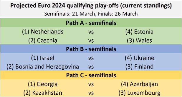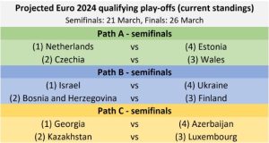 Prema trenutnoj projekciji baraža na osnovu plasmana u kvalifikacionim grupama, ali i plasmana u prošlom ciklusu Lige nacija naši momci bi u polufinalu baraža igrali protiv starih znanaca selekcije Finske na domaćem terenu.