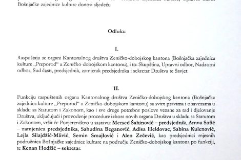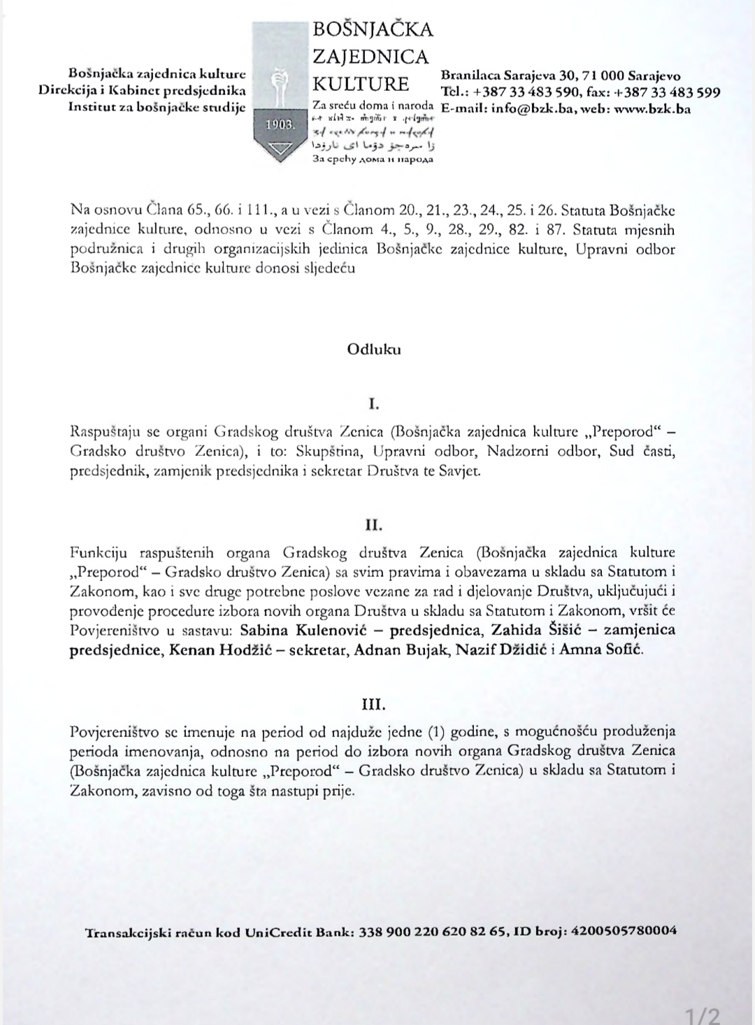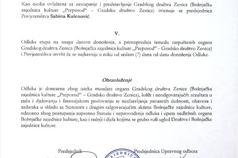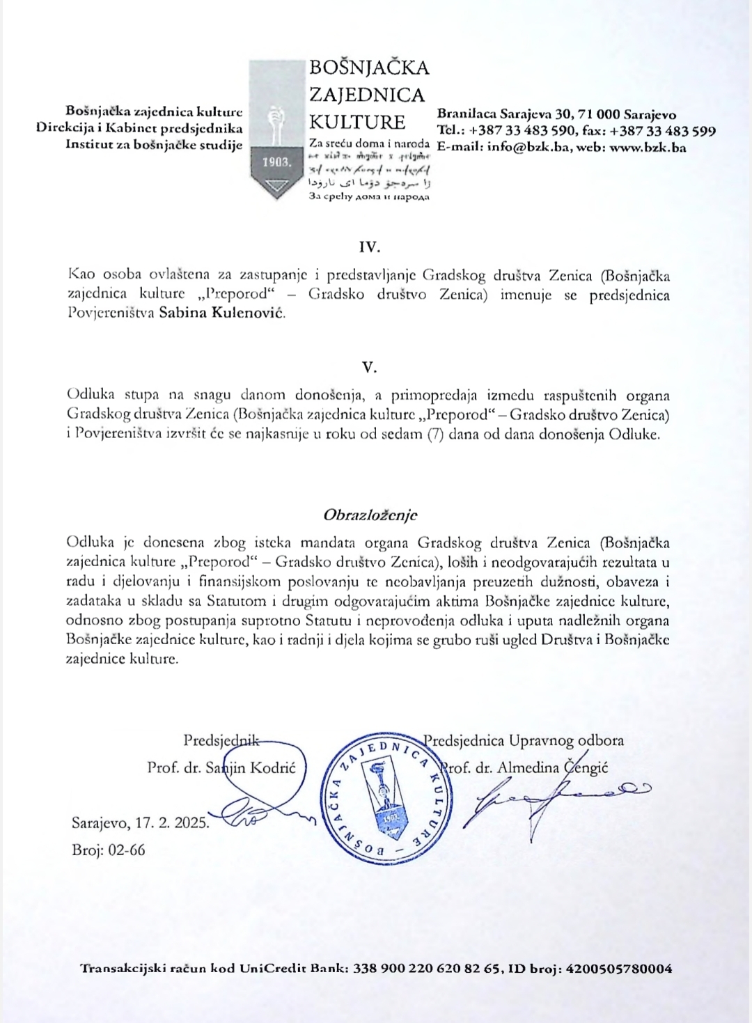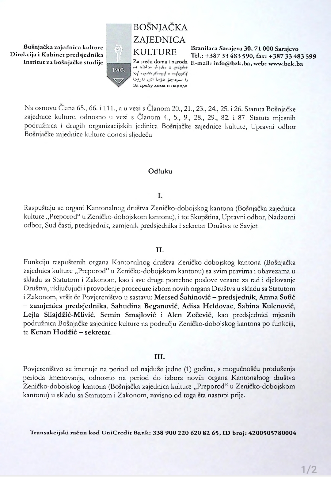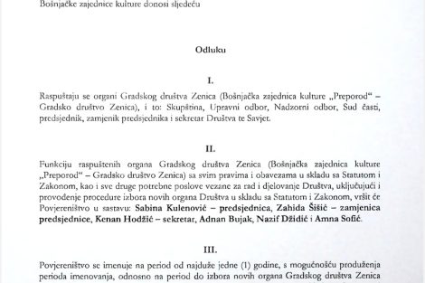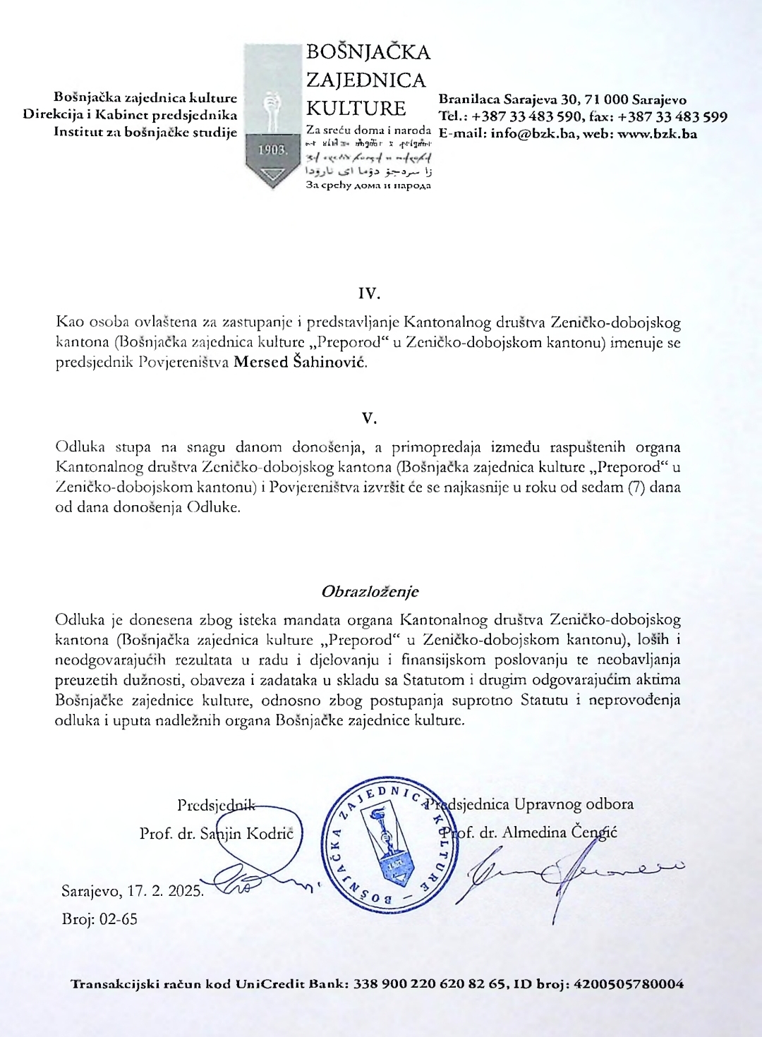 Na osnovu Člana 65., 66. i 111., a u vezi s Članom 20., 21., 23., 24., 25. i 26. Statuta Bošnjačke zajednice kulture, odnosno u vezi s Članom 4., 5., 9., 28., 29., 82. i 87. Statuta mjesnih podružnica i drugih organizacijskih jedinica Bošnjačke zajednice kulture, Upravni odbor Bošnjačke zajednice kulture na sjednici održanoj 17. 2. 2025. godine jednoglasno je donio Odluke o uvođenju povjereništava u sljedećim mjesnim podružnicama Bošnjačke zajednice kulture: Gradsko društvo Zenica, Kantonalno društvo Zeničko-dobojskog kantona, Gradsko društvo Tuzla, Kantonalno društvo Tuzlanskog kantona i Regionalno društvo Hercegovina.