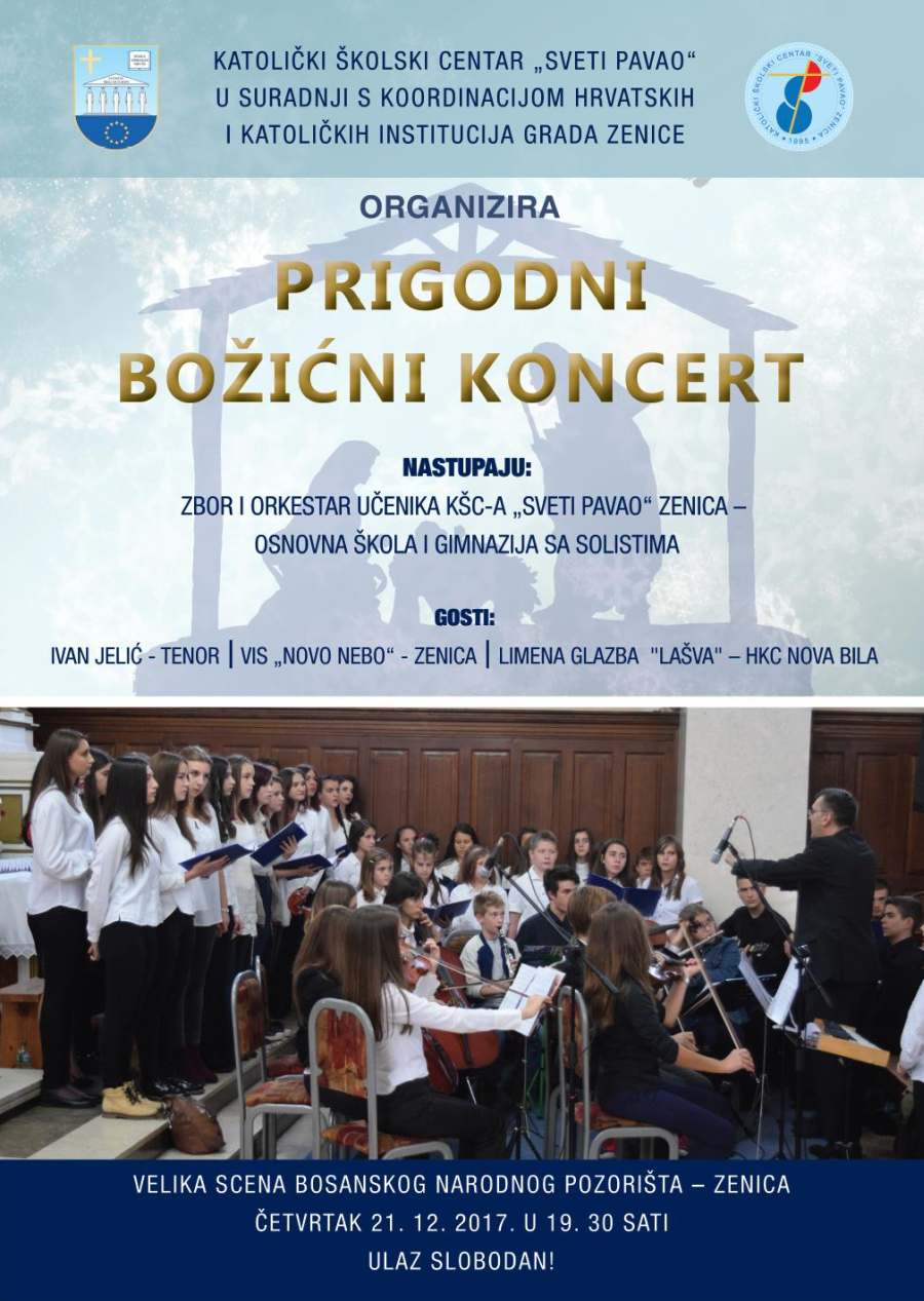 Božićni koncert u BNP Zenica – četvrtak 21.12. u 19.30h – Katolički školski centar “Sv. Pavao” Zenica u saradnji s Koordinacijom hrvatskih i katoličkih institucija i udruga grada Zenice organizira prigodni božićni koncert, koji će se održati u četvrtak, 21. decembra u 19.30 sati u Velikoj sceni Bosanskog narodnog pozorišta u Zenici.