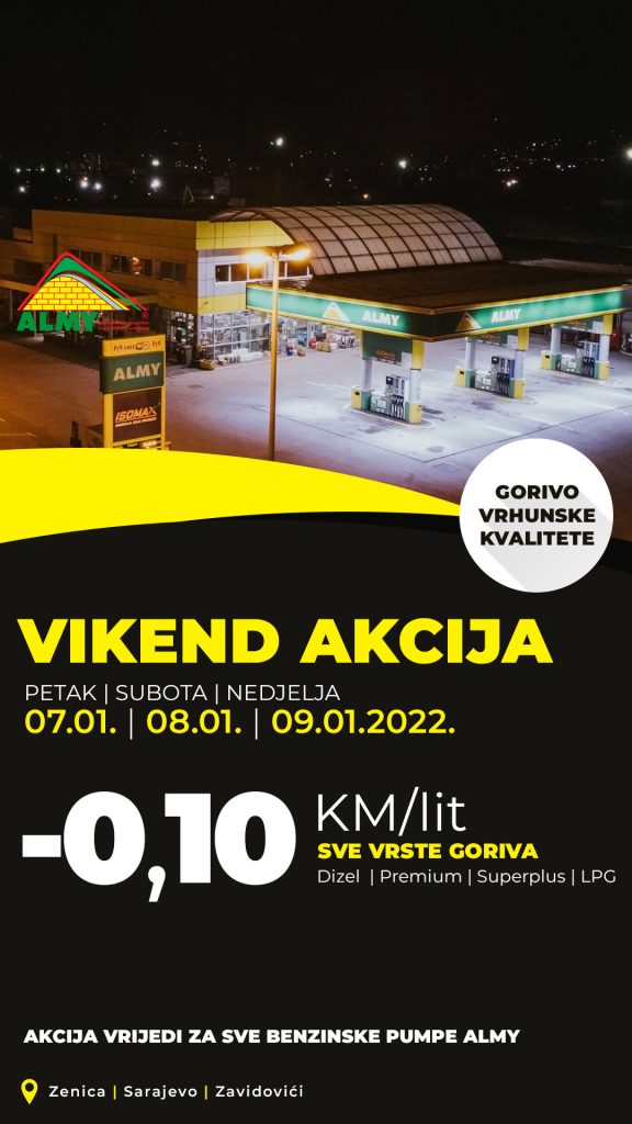 BP Almy: Super vikend akcija!- Super vikend akcija od 07.01. do 09.01.2022. na svim benzinskim pumpama Almy. Sipajte gorivo vrhunske kvalitete povoljnije za 🔖 -0,10 KM po litri 💢🔝