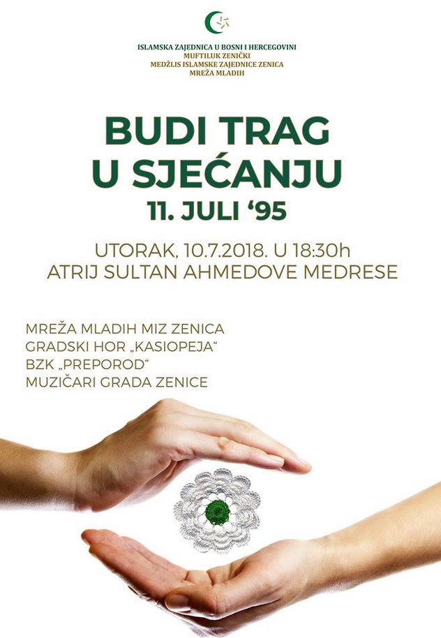 Budi trag u sjećanju 11. juli ‘95. – Mreža mladih Medžlisa IZ Zenica u partnerstvu sa prijateljima iz Gradskog hora “Kasiopeja”, BKZ “Preporod” i muzičarima grada Zenice organizuje u utorak, 10.07.2018. godine u Sultan-Ahmedovoj medresi s početkom u 18:30 sati, program sjećanja na žrtve genocida u Srebrenici – “BUDI TRAG U SJEĆANJU 11.JULI ’95”