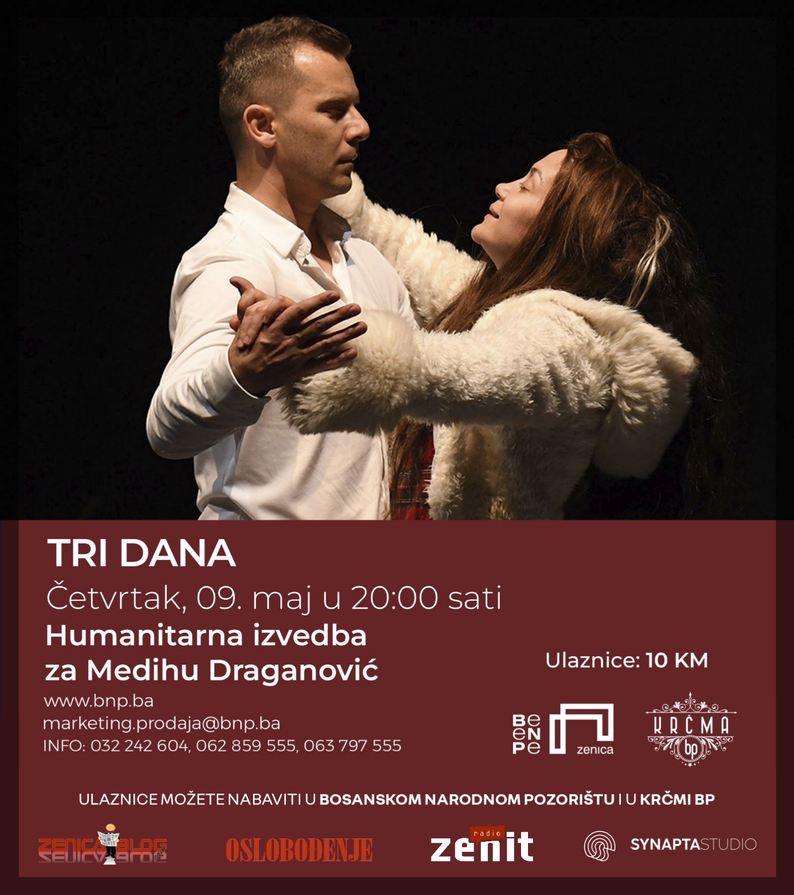 S namjerom da pomogne u prikupljanju sredstava za troškove liječenja naše sugrađanke Medihe Draganović, koja duže vrijeme boluje od nesitnoćelijskog raka pluća, Bosansko narodno pozorište Zenica priredit će predstavu “Tri dana” (Pad i uspon gospodina B.) 9. maja ove godine sa početkom u 20,00 sati.