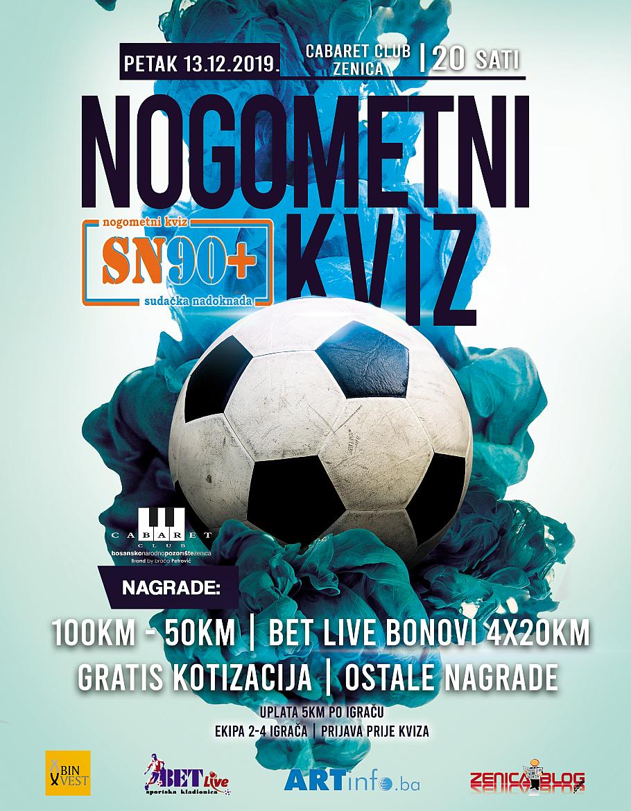 A s Englezima mogli bi se porediti i po svojoj pasioniranosti prema najvažnijoj sporednoj stvari na svijetu – nogometu. No, šta se dobije kad se spoje, na prvi pogled dvije nespojive ljubavi, nogomet i kviz, najbolje ćemo saznati u petak, 13. decembra, na “Sudačkoj nadoknadi” koja će se, kao i mnogobrojne dosadašnje neviđene atrakcije u našem gradu, odigrati u “Cabaret clubu” s početkom u 20,00 sati.