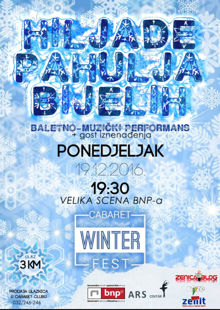 U okviru CABARET WINTER FEST-a, na velikoj sceni Bisanskog narodnog pozorišta Zenica, održat će se baletno-muzički performans “HILJADE PAHULJA BIJELIH”.Organizatori iz Cabaret club-a, kao i baletni studio Ars centar Zenica, ističu kako je ovo jedinstven projekat, koji javnost nema baš priliku često gledati u našem Gradu.