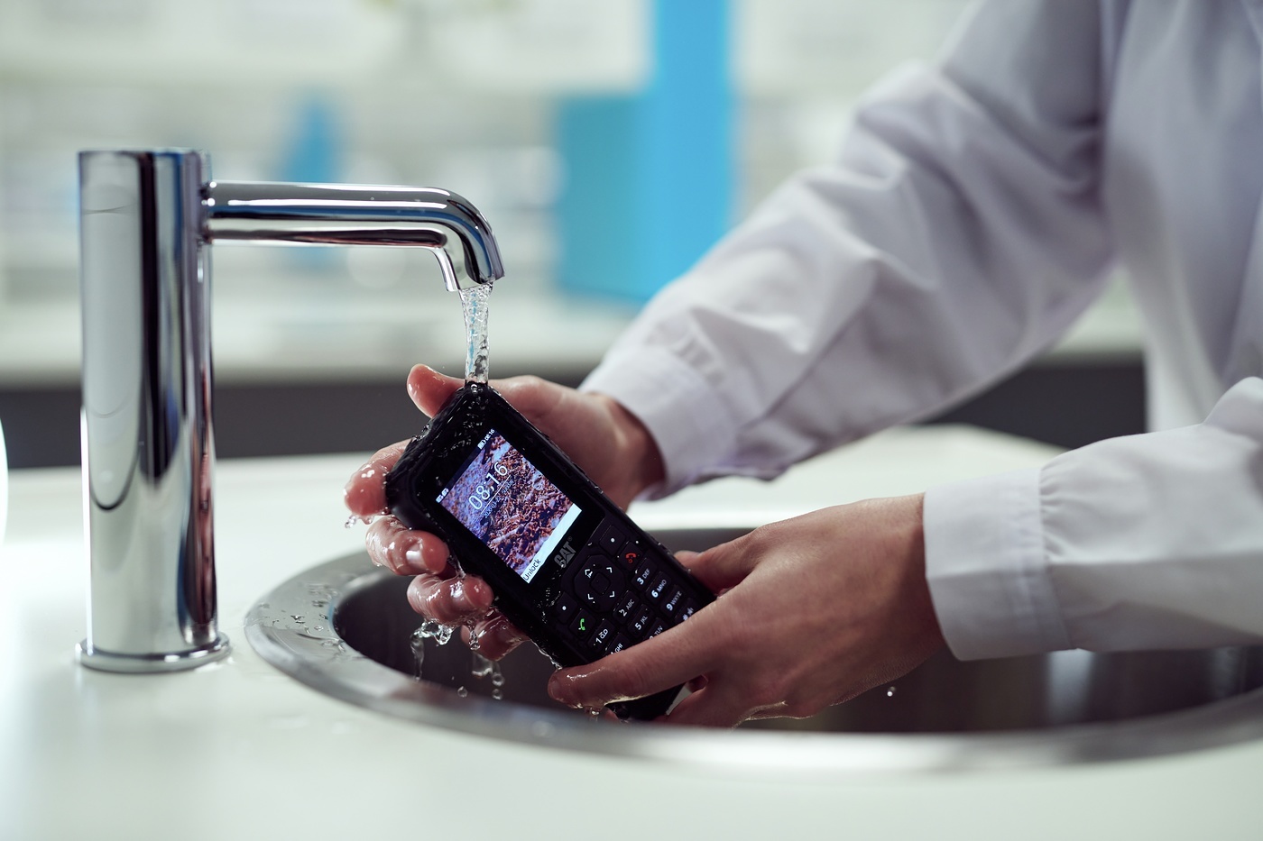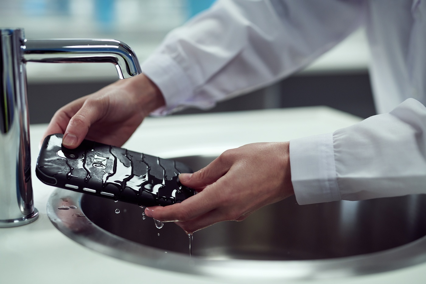 Kao i svi Cat telefoni, i ovaj je vodootporni telefon certificiran prema IP68 i IP69. Ne samo da se može u potpunosti potopiti u toplu sapunicu i neprestano prati, već je podvrgnut ekstremnim testiranjima s izbjeljivačima čak 3000 puta, te se nesmetano koristio u okolini s hemijskim smjesama poput raznih sanitarija. Jasno je da ova kombinacija inovacija postavlja novi standard u higijenskom dizajnu telefona.