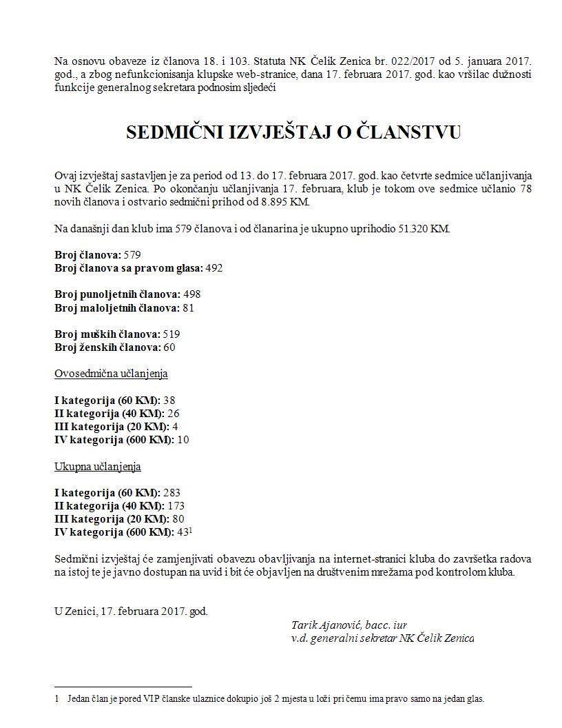 NK Čelik: 135 članova u protekloj sedmici – sedmični prihod 9.860 KM – U skladu sa statutarnom obavezom, a do osposobljavanja klupske web-stranice...