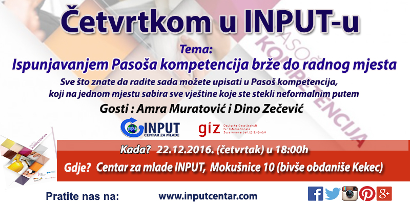 Ispunjavanjem Pasoša kompetencija brže do radnog mjesta – četvrtak u 18 sati – Pozivamo vas da i ovog četvrtka svoje vrijeme provedete u INPUT-u...