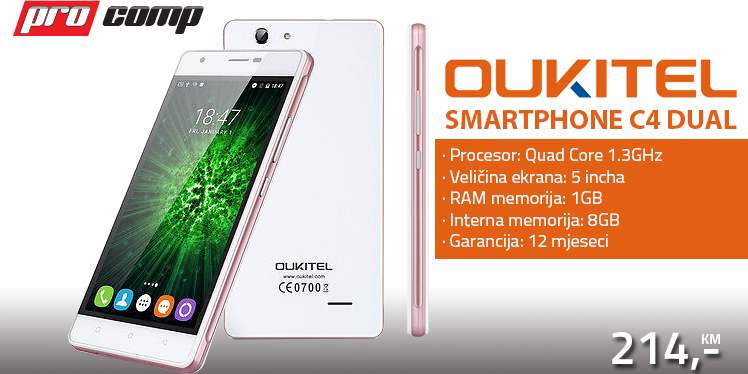 Novo u PROCOMP-u! Mobitel OUKITEL Smartphone C4 Dual za samo 214 KM! Quad Core procesor i 1 GB RAM-a omogućiće Vam nesmetan rad svih aplikacija na Vašem...