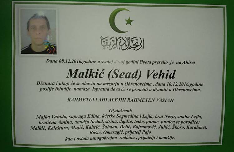 Dženaza gaziji Vehidu Malkiću u subotu nakon ikindije – Preminuo Vehid Malkić – gazija sa dva bisera u očima – U četvrtak, 8.12. 2016. na...