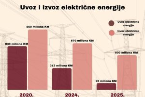 Tokom 2025. godine, Bosna i Hercegovina uvezla je najviše električne energije do sada i to u vrijednosti približno 629 miliona maraka, dvostruko više nego 2024...