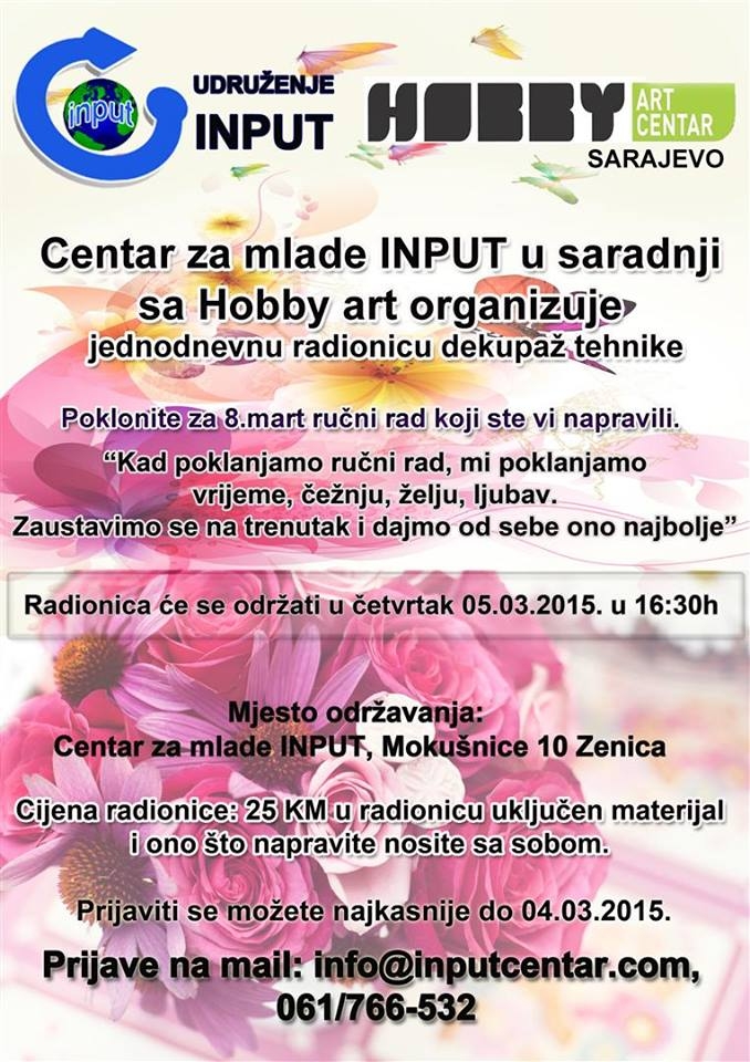Centar za mlade INPUT organizuje jednodnevnu radionicu dekupaž tehnike u saradnji sa Hobby Art Centar koja će se održati u četvrtak 05.03.2015. u Centru za...