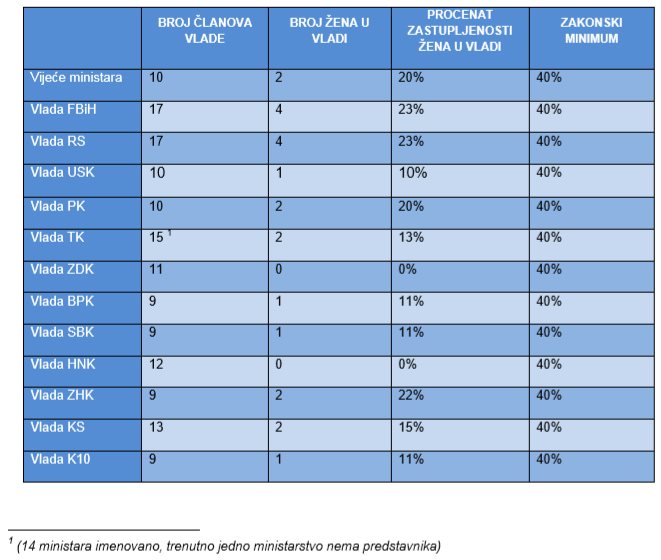 Naime, nijedna vlada u BiH, od 10 kantonalnih, preko dvije entitetske, pa do Vijeća ministara, ne poštuje Zakon o ravnopravnosti polova u BiH, koji jasno propisuje da zastupljenost manje zastupljenog pola ne smije biti ispod 40% i da se sve ostalo smatra diskriminacijom, čije se otklanjanje ovim zakonom zahtjeva.