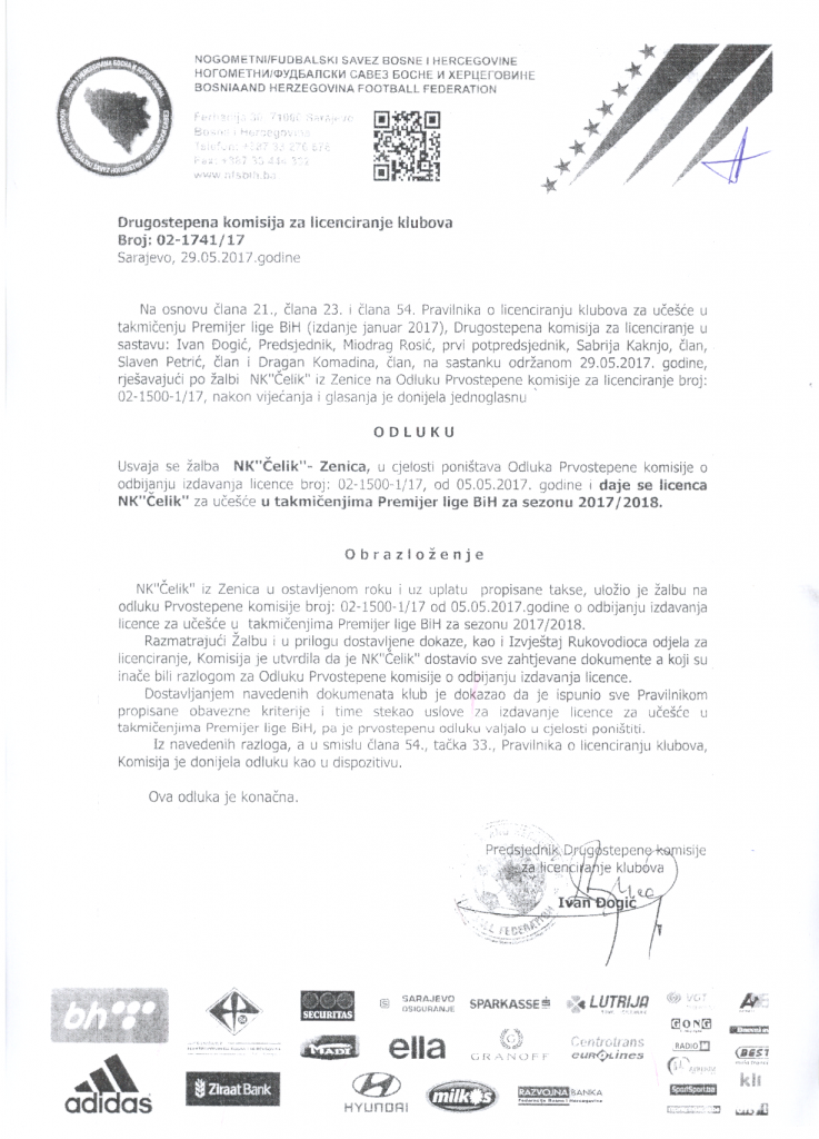 Čelik dobio licencu za narednu sezonu! – Odlukom Drugostepene komisije za licenciranje Nogometnog/fudbalskog saveza Bosne i Hercegovine Nogometni klub Čelik dobio je licencu za takmičenje u BH Telecom Premijer ligi u sezoni 2017/18. Nakon što je ekipa izborila ostanak na terenu, sada su otklonjene i sve administrativne prepreke i Čelik se naredne sezone ponovo takmiči u društvu najboljih!