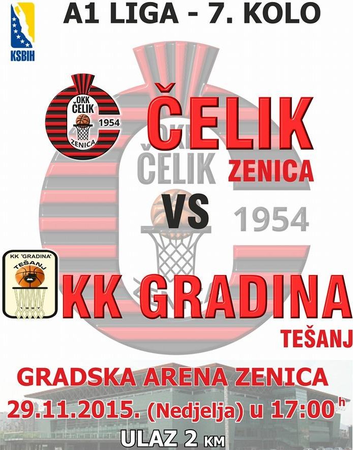 Utakmica OKK Čelik – KK Gradina Tešanj na rasporedu je u nedjelju 29.novembra 2015.godine u Areni Zenica, sa početkom u 17 sati. Ulaz je 2 KM.