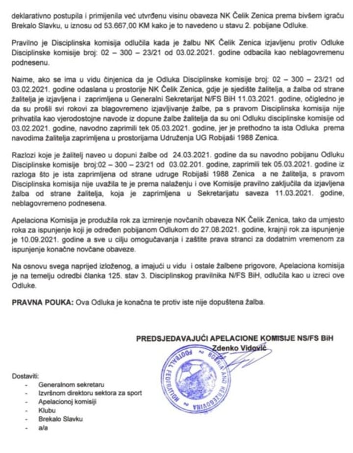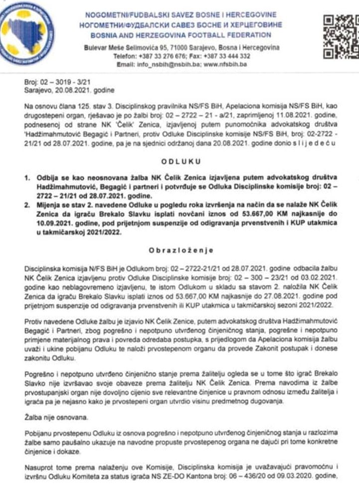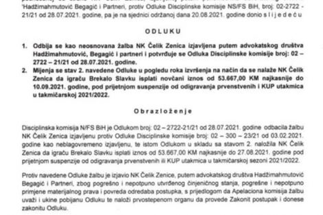Nogometni savez BiH poslao je na adresu Čelika odluku da Brekalu moraju isplatiti 53.667 KM koliko mu duguju i ukoliko to ne urade danas do 16 sati prijeti im suspenzija odigravanja prvenstvenih i kup utakmica u ovoj sezoni.