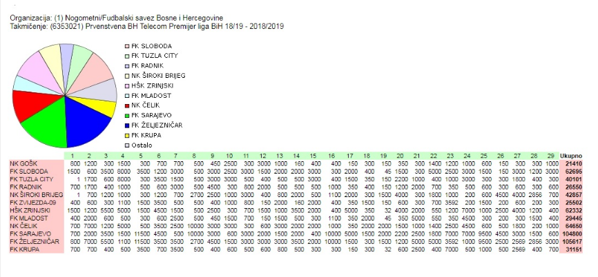 Slijede Zrinjski (27.332), Tuzla City (22.650), Široki Brijeg (21.401), Mladost (10.200), Radnik (8.100), Krupa (7.200), GOŠK (6.300) i Zvijezda 09 (5.510).