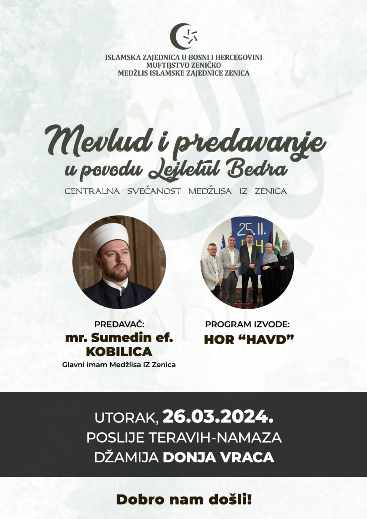 Ova svečanost održat će se u utorak, 26. marta 2024. godine, poslije teravih-namaza u džematu Donja Vraca, džamija Donja Vraca.