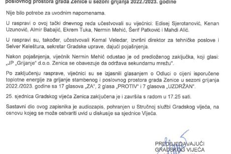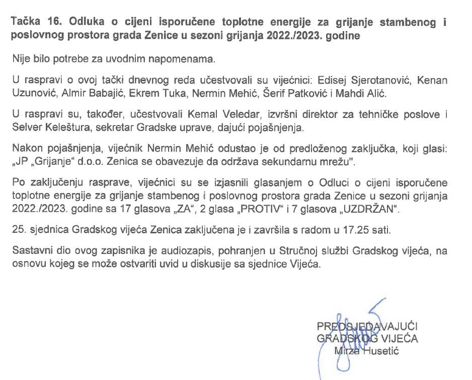 Uputili smo Zahtjev JP Grijanje, ali nismo dobili odgovor na osnovu čega je došlo do korekcije cijena. Kad neće JP Grijanje, hoće “surfanje” po odlukama Gradskog vijeća Zenica. Tako je vidljivo da je u julu prošle godine, Gradsko vijeće Zenice kao 17. posljednju tačku dnevnog reda u 17 sati poslijepodne donijelo Odluku o cijenema grijanja, između ostalog, u Odluci stojid a se sezona može produžiti “na zahtjev i o trošku korisnika do 1.5. ili početi ranije”