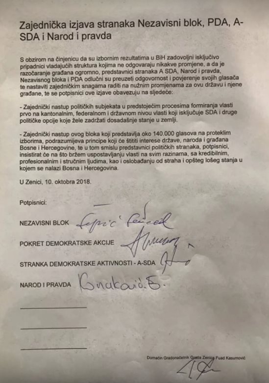 Kako Klix.ba saznaje iz pouzdanih izvora, danas je u Zenici dogovoren zajednički nastup četiri stranke u pregovorima za formiranje vlasti na svim nivoima gdje to bude moguće i gdje su zastupljene. Dogovor je postignut između Stranke demokratske aktivnosti (ASDA), Naroda i pravde (NiP), Nezavisnog bloka (NB) i Pokreta demokratske akcije (PDA).