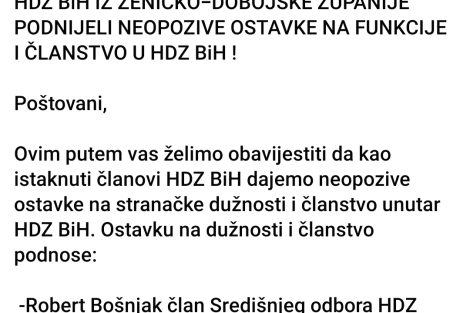 Ovim putem vas želimo obavijestiti da kao istaknuti članovi HDZ BiH dajemo neopozive ostavke na stranačke dužnosti i članstvo unutar HDZ BiH. Ostavku na dužnosti i članstvo podnose: