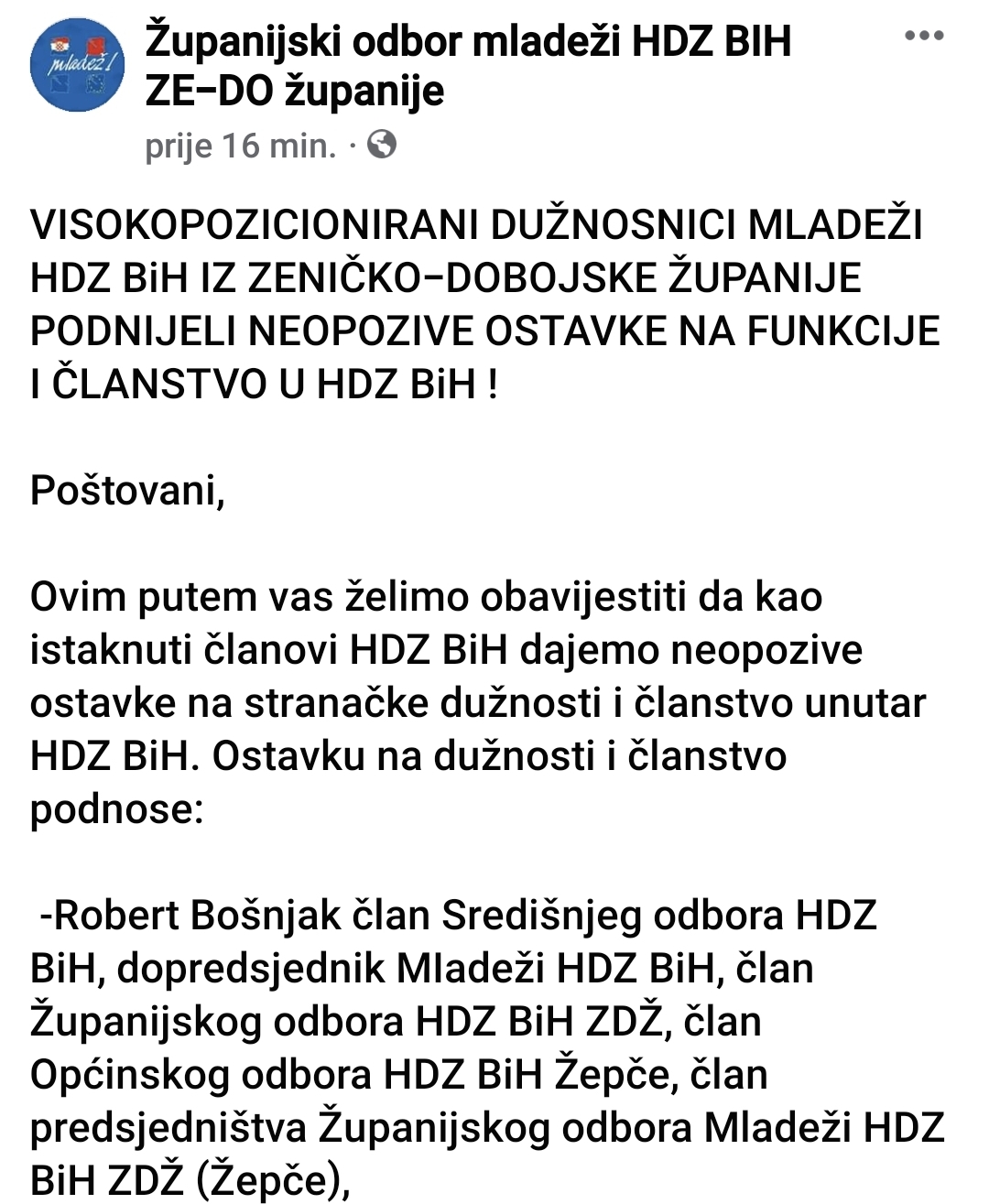 VISOKOPOZICIONIRANI DUŽNOSNICI MLADEŽI HDZ BiH IZ ZENIČKO-DOBOJSKE ŽUPANIJE PODNIJELI NEOPOZIVE OSTAVKE NA FUNKCIJE I ČLANSTVO U HDZ BiH !