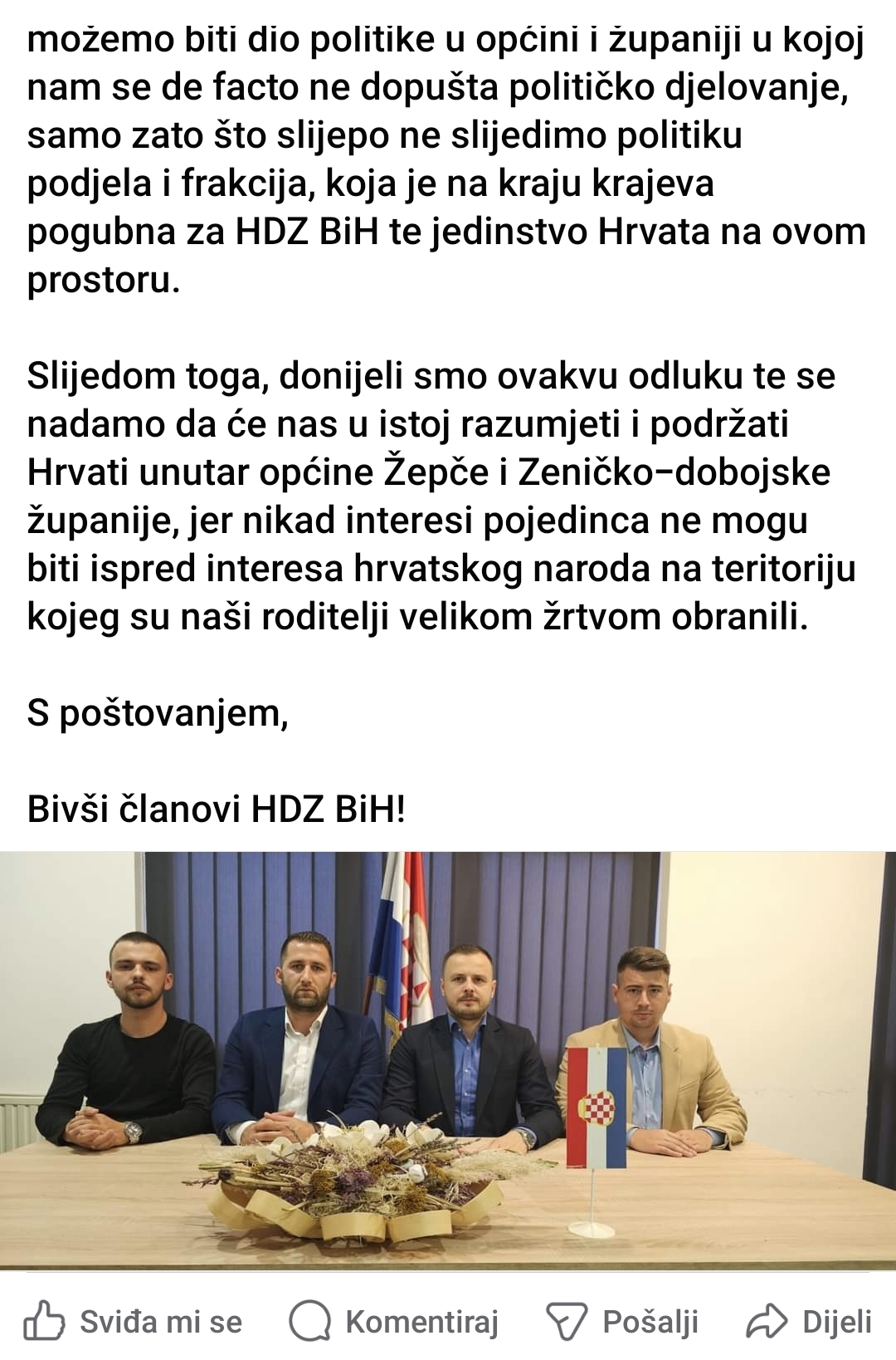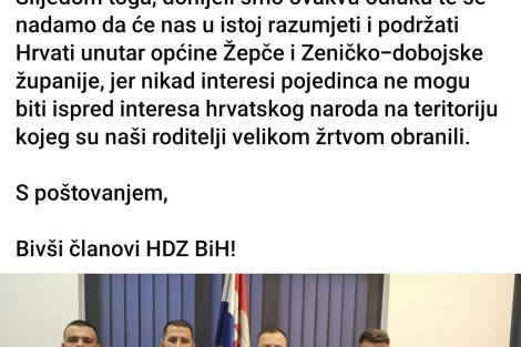 Slijedom toga, donijeli smo ovakvu odluku te se nadamo da će nas u istoj razumjeti i podržati Hrvati unutar općine Žepče i Zeničko-dobojske županije, jer nikad interesi pojedinca ne mogu biti ispred interesa hrvatskog naroda na teritoriju kojeg su naši roditelji velikom žrtvom obranili.