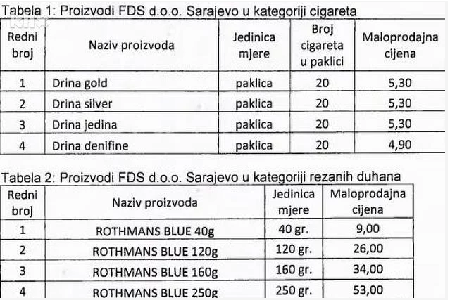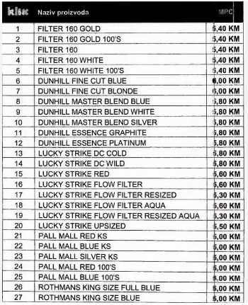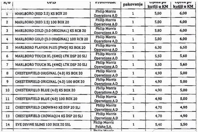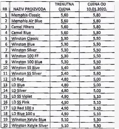 Tako naprimjer Drina poskupljuje za 20 feninga, Memphis, Winston, LD i Chesterfield za 20 feninga, a Marlboro od 10 do 20 feninga.