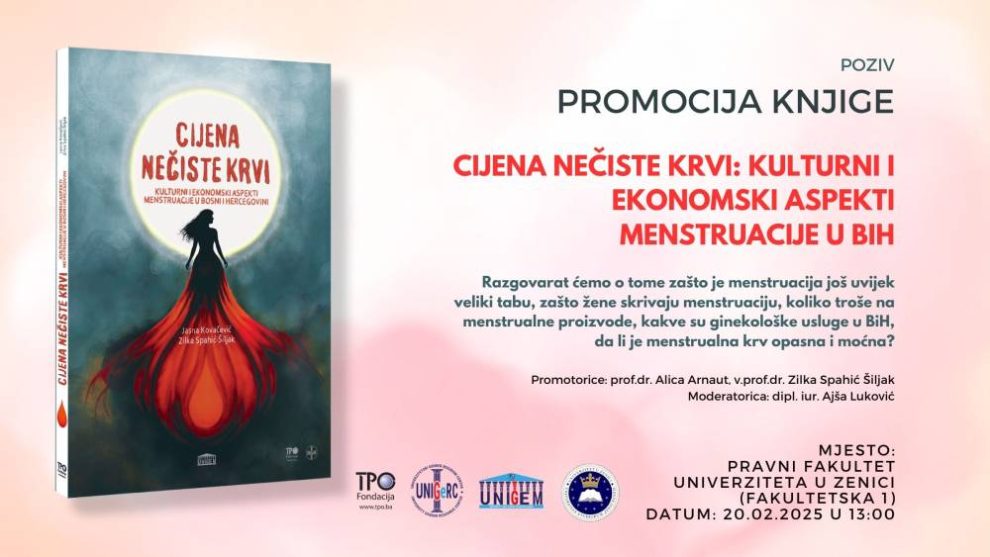 Pozivamo vas na promociju knjige “Cijena nečiste krvi: kulturni i ekonomski aspekti menstruacije u BiH” autorica v. prof. dr. sc. Zilke Spahić Šiljak i v. prof. dr. sc. Jasne Kovačević.