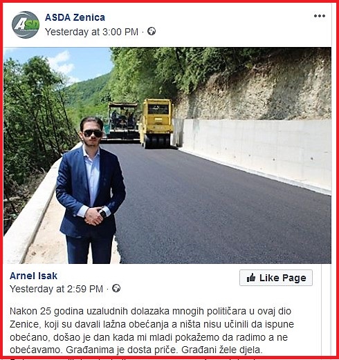 A-SDA se pohvalila urađenim putem svog ministra prostornog uređenja Arnela Isaka uz prethodne medijske najave kako „ministar Isak izdvaja milion maraka za sanaciju puta“.