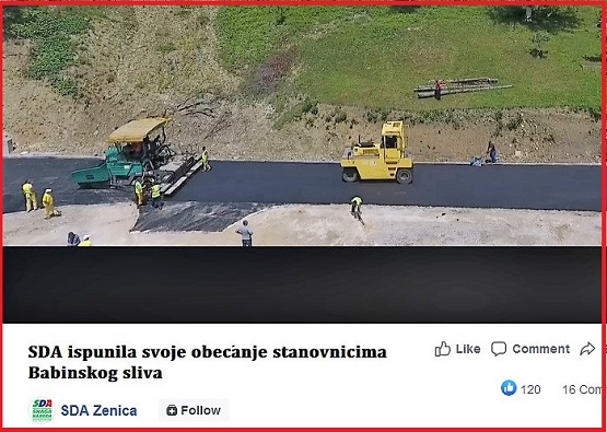 Posljednji primjer imamo u Zenici. Okončanjem rekonstrukcije 1,2 od ukupno 18 km puta koji vodi prema 26 naselja sliva Babine rijeke, Seoca, Briznika, Arnauta, Babina pa sve do Puhovca, slijedile su stranačke samohvale kako su upravo oni zaslužni za uređenje dijela puta, kako kažu “konačno, nakon 25 godina“.