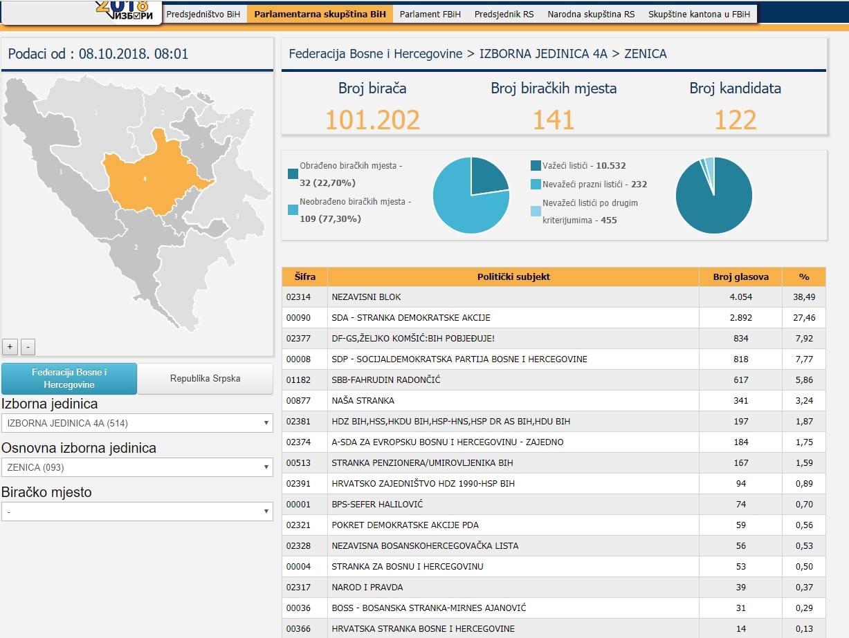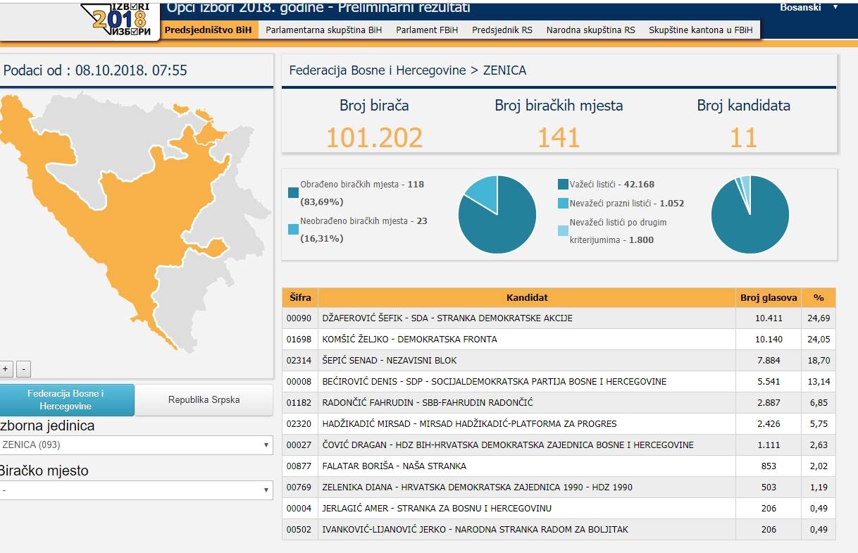 CIK BiH: Pogledajte kako su glasali Zeničani za sve nivoe vlasti – Centralna izborna komisija BiH objavila je preliminarne nepotpune zvanične rezultate za sve nivoe, od Predsjedništva BiH, do kantonalnih skupština. Na oficijelnoj stranici moguće je “izdvojiti” glasove po gradovima, pa vam tako donosimo rezultate kako su glasali upisani u Birački spisak na području Zenice, za sve nivoe vlasti. U gornjem lijevom uglu je navedeno vrijeme kad su ažurirani podaci CIK-a.