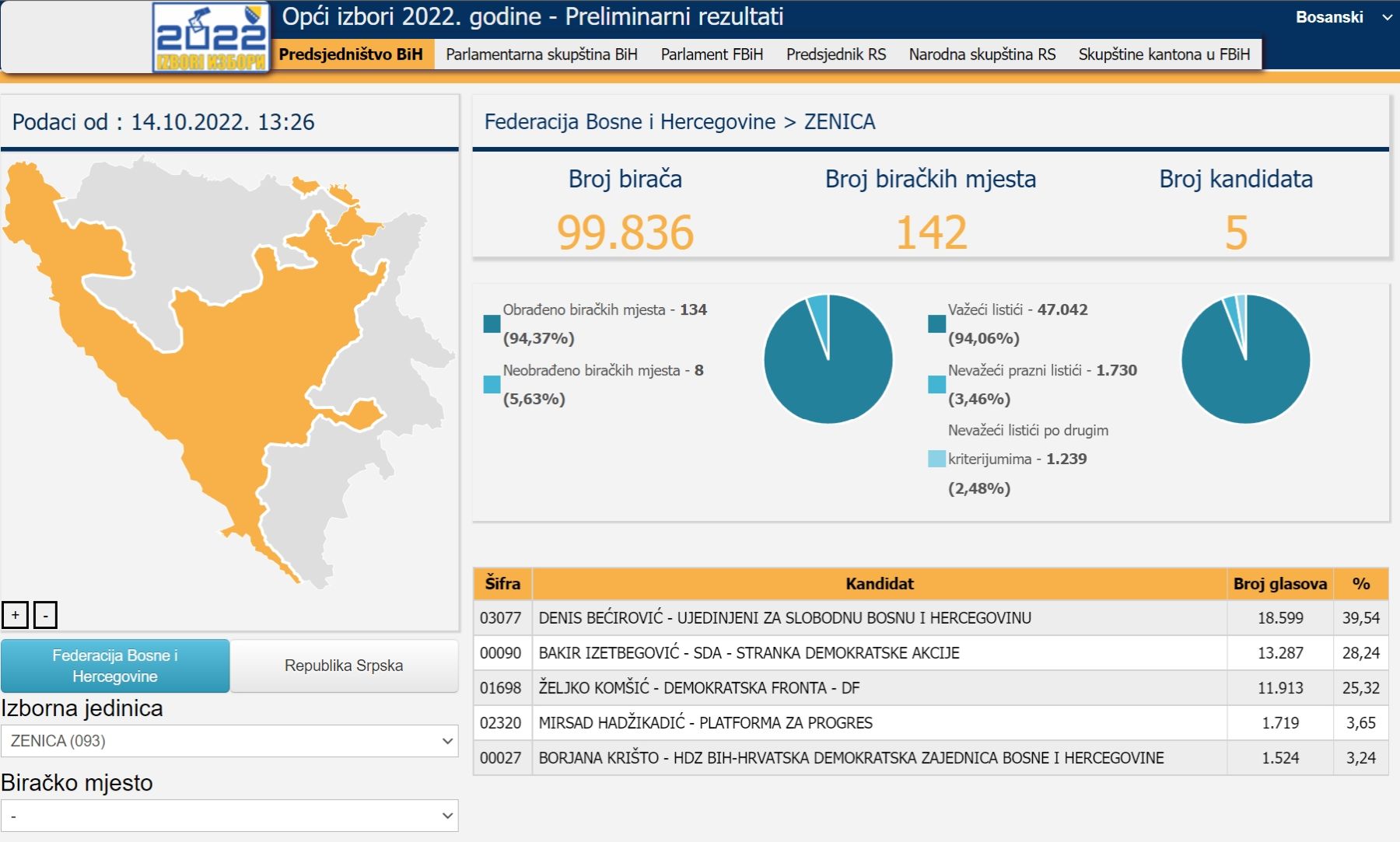 Centralna izborna komisija BIH danas popodne (petak) je objavila najnovije nepotpune preliminarne nezvanične rezultate za Predsjedništvo BIH, Parlamentarnu skupštinu BIH, Parlament FBIH i Kantone u Federaciji. Donosimo rezultate koji najviše interesiraju čitaoce portala sa područja Zeničko-dobojskog kantona i Zenice.