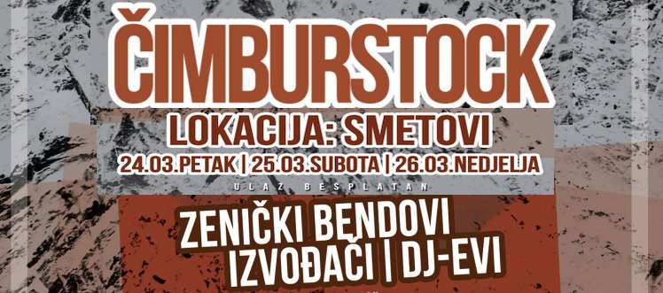 ČIMBURSTOCK – muzički festival na Smetovima – 24., 25. i 26. mart – ČIMBURSTOCK je muzički festival koji će se održati 24. 25. i 26. marta na Smetovima u okviru projekta “Zeničko Proljeće”. Nastupaju zenički bendovi, izvođači i dj-evi.