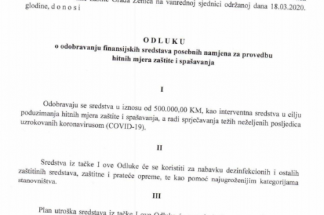 U skladu sa ovom odlukom odobrena su sredstva u iznosu od 500.000,00 KM, kao interventna sredstva u cilju poduzimanja hitnih mjera zaštite i spašavanja, a radi sprječavanja težih neželjenih posljedica uzrokovanih koronavirusom (COVID-19).
