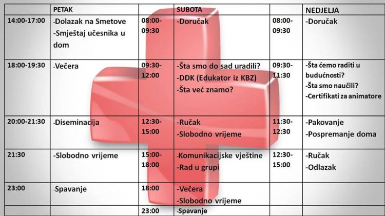 2. Organizuje edukativni kamp za mlade sa akcentom na dobrovoljno darivanje krvi, a uz podršku Federalnog ministarstva rada i socijalne politike, 26.-27.-28.08.2016.g., Planinarski dom “Željezara Zenica” na Smetovima. Uz predavanje stručnog osoblja Transfuzijskog centra KBZ, biće dodijeljeni i certifikati za animatore dobrovoljnog darivanja krvi. U prilog dostavljamo plan rada kampa.