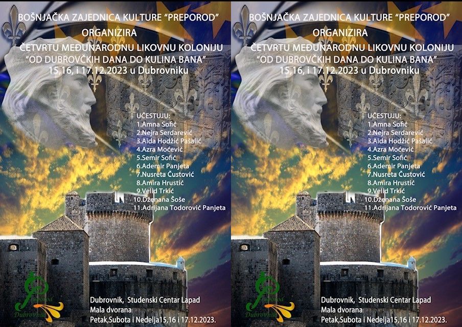 4.internacionalna likovna kolonija „Od Dubrovačkih dana do Kulina bana“ realizovat će se od 15. 12. do 17. 12. 2023. godine.u Dubrovniku.