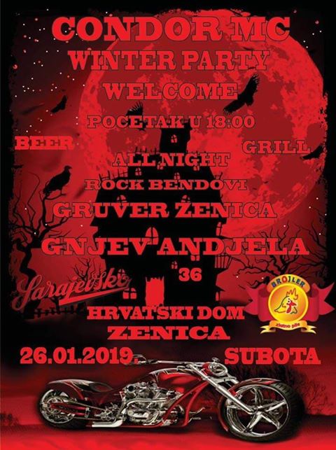 Condor MC – Winter Party u HKD – subota 26.01. u 20h – U subotu 26.01. u 20h. Condor MC organizuje Winter Party u prostorijama HKD i poziva sve one koji su raspoloženi za odličnu svirku da dođu i uživaju u odličnoj rock zabavi.