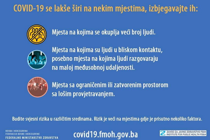 Krizni štab FBiH apeluje da se izbjegavaju mjesta na kojima se okuplja veći broj ljudi, mjesta na kojima su ljudi u bliskom kontaktu, posebno mjesta na kojima ljudi razgovaraju na maloj međusobnoj udaljenosti.