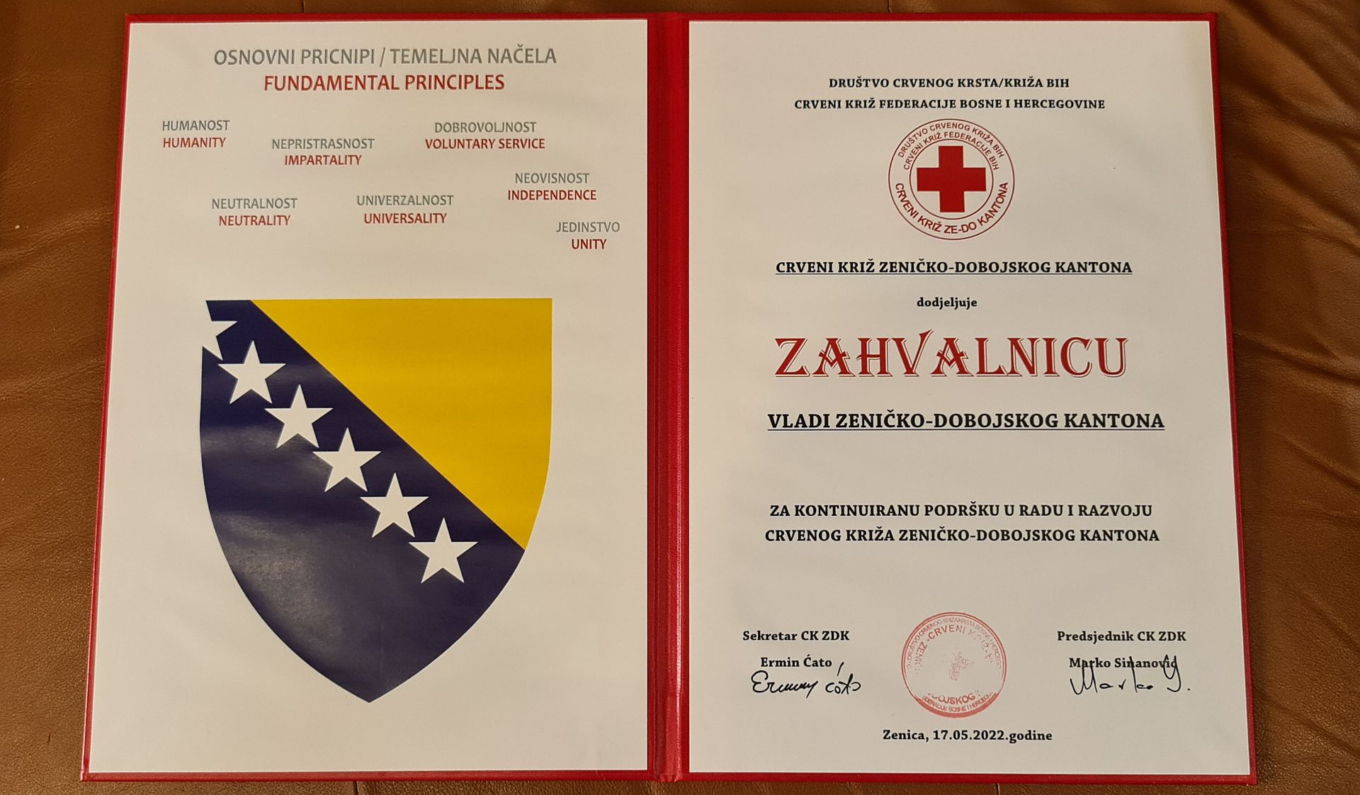 Predsjednik Skupštine Crvenog križa Zeničko-dobojskog kantona (CK ZDK) Marko Sinanović uručio je zahvalnicu premijeru Mirnesu Bašiću za kontinuiranu podršku Vlade Zeničko-dobojskog kantona u radu i razvoju ove kantonalne organizacije.