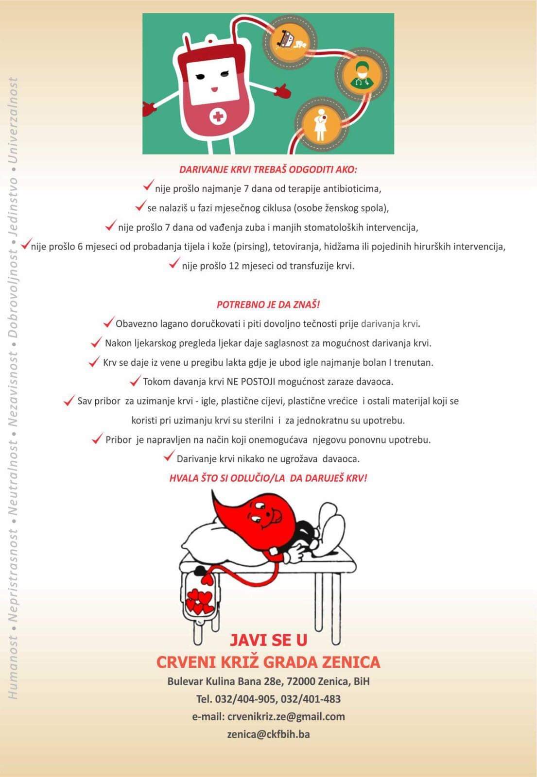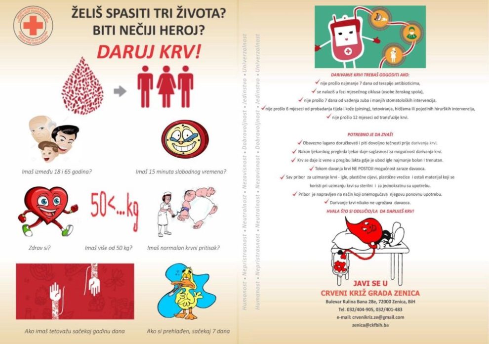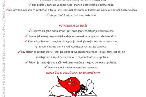 Krv je jedini lijek koji ne možete kupiti, stoga je vrlo važno podizati svijest o dobrovoljnom davalaštvu krvi čiji su osnovni principi solidarnost, dobrovoljnost, anonimnost i besplatnost.