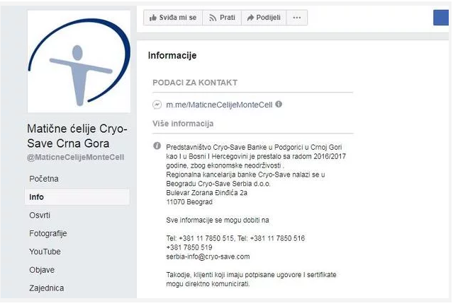 Kada posjetite stranice CryoSave za BiH, Srbiju i Crnu Goru i njihove društvene mreže, uvidjet ćete da su informacije posljednji put objavljene prošle godine. Web stranica za BiH nije nikada završena, a ponuđeni broj mobitela nije u funkciji. Na crnogorskoj web stranici ove kompanije klijente iz BiH upućuju na broj telefona u Srbiji. Ni taj broj nije u funkciji. U objašnjenju navode kako su predstavništva u BiH i Crnoj Gori prestala raditi 2016/2017. godine zbog ekonomske neodrživosti.